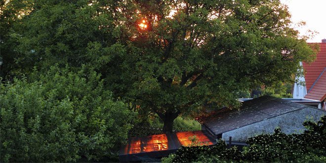 Nach einem Regenschauer strahlte die aufgehende Sonne über Bad Harzburg. Hierbei spiegelte sie sich auf dem regennassen Dach eines Holzüberstandes.