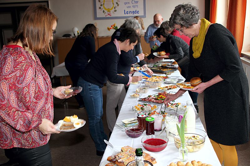 Die Lengde AG Kultur hatte zum 1. Lengder Kulturfrühstück eingeladen, das von der Gruppe der Partymeile der Lengde AG zuvor vorbereitet worden war. Auf dem Buffet war für jede Geschmacksrichtung etwas dabei. Neben Marmelade, Wurst, Käse und Ei auch Lachs, einen Obstsalat und eine Quiche. Die Wurst wurde von Broihans Bauernhof und der Käse und Joghurt von Niehoffs Bauernhof gespendet. Hierfür bedankte sich die Ortsvorsteherin in ihrer Ansprache ganz herzlich.