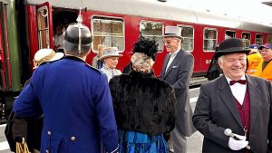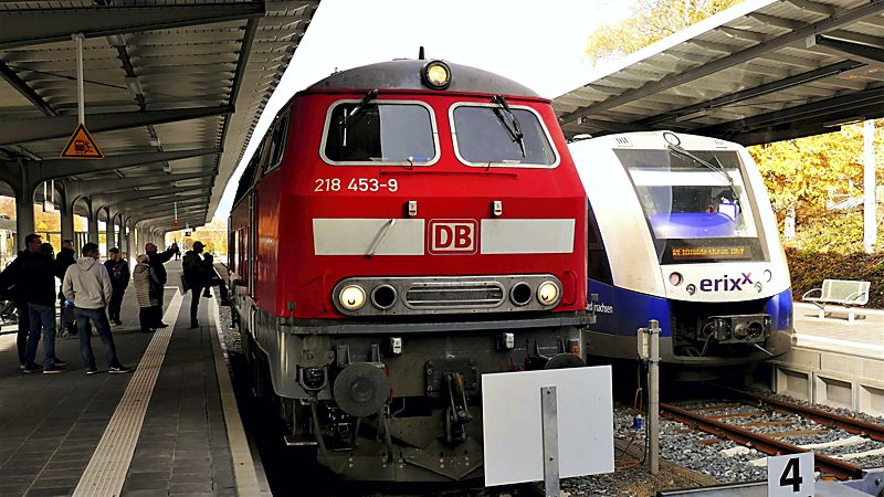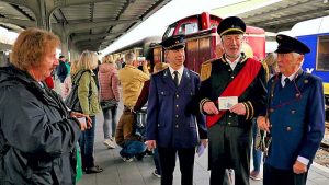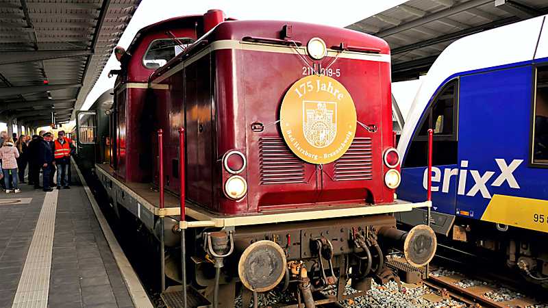 Die beiden Jubiläumszüge nach Braunschweig und zurück mussten leider mit einer Diesellok der Baureihe V 100 gezogen werden, weil die historische Dampflokomotive der Baureihe 52 wegen eines Lagerschadens ausgefallen war.