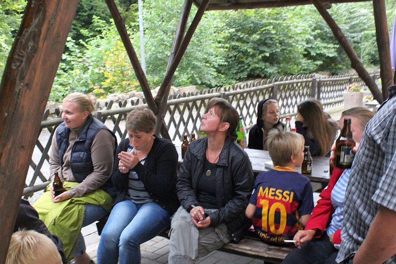 Vorbei am Lehrerdenkmal für Leopold Pfeil, hinab nach Treseburg, durch das Bodetal, über die Teufelsbrücke zur Gaststätte Königsruhe. Eine kurze Rast bei Kaffee, Pils oder Pommes und weiter zur Jugenherberge. Zimmerverteilung, Betten beziehen, Duschen und schon stand der Grillabend an, gemütliches Beisammensein inklusive. Die jüngeren Teilnehmer beschäftigten sich mit Tischfussball oder dem Flipper, ehe man sich in den Schlaf verabschiedete.