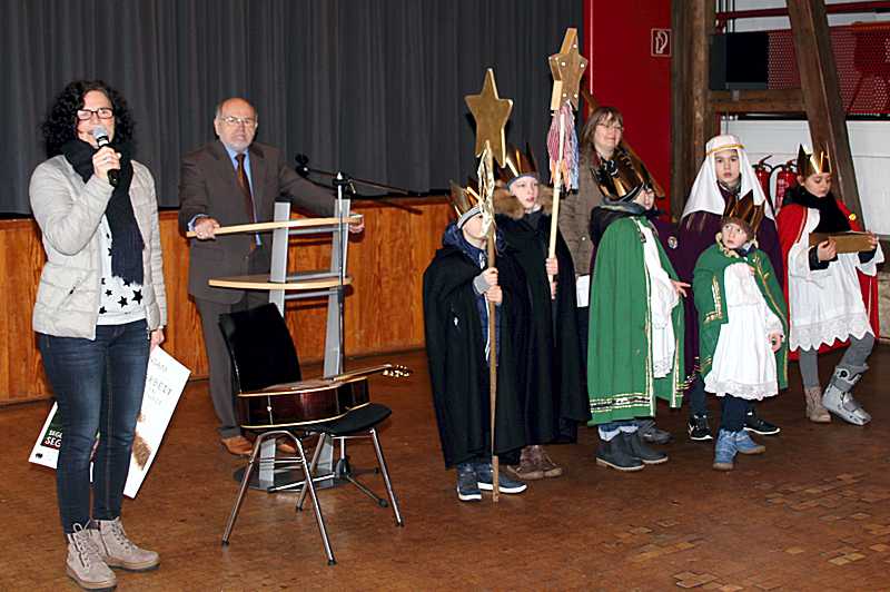 Bereits in der Kirche waren die Sternsinger zu Gast und im Dorfgemeinschaftshaus brachten sie den Segen für die Gäste. Segen bringen Segen sein, gemeinsam gegen Kinderarbeit in Indien und Weltweit, unter diesem Leitwort stand die Sternsingeraktion in diesem Jahr. Begleitet durch Silke Kleinert mit der Gitarre sowie Cornelia Keie sangen die Kinder ihr diesjähriges Mottolied Dafür. Ortsbürgermeister Heinz-Jürgen Wiechens lobte die Kinder, dass sie bei Wind und Wetter von Tür zu Tür gegangen sind und den Segen gespendet und für andere bedürftige Kinder gesammelt haben.