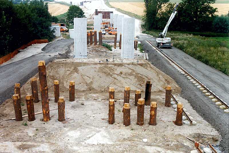 Die Lärchenstämme sorgten, senkrecht in die Erde gerammt, für die sichere Lagerung der Stützen im sumpfigen Boden für die Schalung der Brücke. Der entstandene Lärm verfolgte die Schladener über Wochen. Die Schalung wurde später wieder abgebaut, als der Beton hart geworden war. Beeindruckt waren die Zuschauer zu sehen, welch ein Aufwand für diesen Bau betrieben werden musste. So musste auch erst eine Bauhilfsbrücke gebaut werden, damit die schweren Baumaschinen und großen Laster nicht immer einen Umweg fahren mussten, um die Materialien abzuliefern.