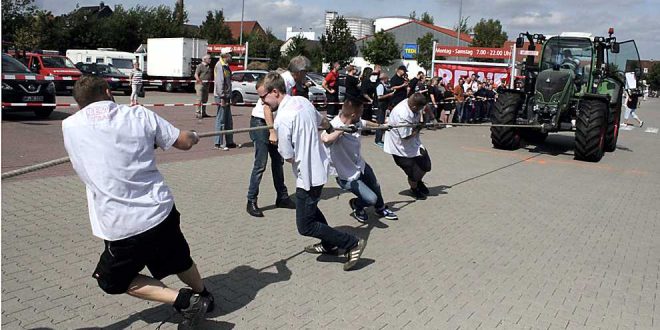 Löwenstark Treckerpulling SchladenJede Mannschaft musste einen 7735 kg schweren und 165 PS starken Trecker ziehen, als Fahrer fungierte Gemeindebrandmeister Daniel Zalesinski. Die Jugend- und Frauen-Teams mussten den Trecker mit acht Teilnehmern 20 m ziehen, die Herrenmannschaften traten mit fünf Teilnehmern an und hatten nach 30 m das Ziel erreicht. Vier Feuerwehren beteiligten sich mit 15 kg schweren Atemschutzgeräten (AGT) auf dem Rücken am Wettkampf.
