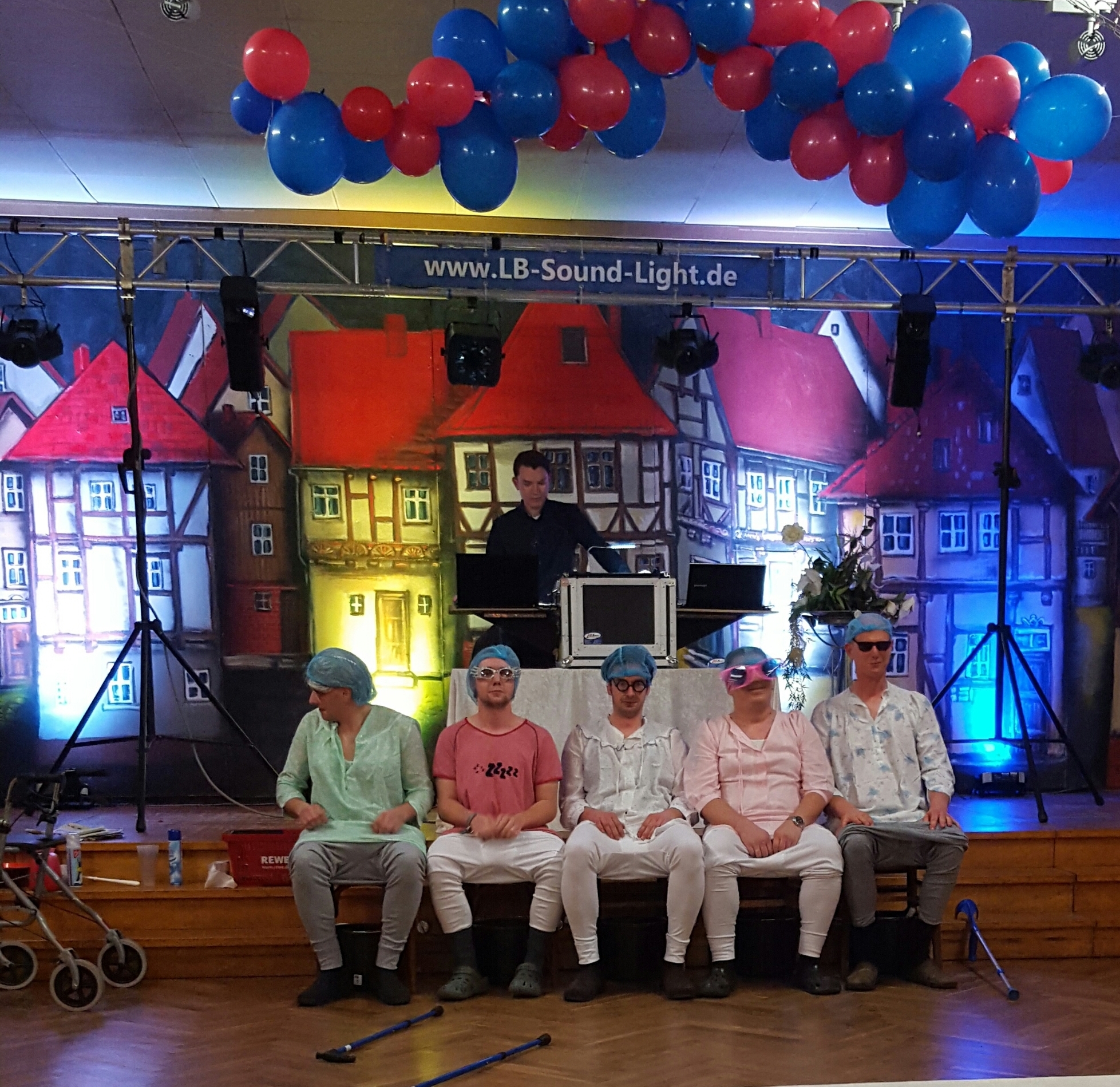 Nach dem Festmahl und dem Eröffnungstanz von Hesse und Partnerin gab es einige Zeit später wieder eine lustige Showeinlage. Da wir alle nicht jünger werden, verkleidete sich die Feuerwehrtruppe als altersschwache Seniorengruppe in klassischen Nachthemden und Gehhilfen. Auf Pfeifton der Krankenschwester hin wurde pariert. Alle hatten sichtlich ihren Spaß und es kam zu einer Zugabe.
