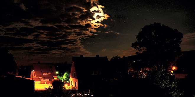 Auf dem Foto schaut Petrus auf den Harz und überlegt, wie er das Wetter gestalten soll. Dabei leuchten der Mond und die Sterne durch die Wolkendecke. Das Foto habe ich am 15.08.2017 um 02.01 Uhr in Bad Harzburg aufgenommen. Text/Foto: Helmut Gleuel