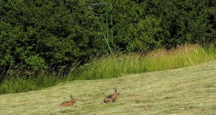 Die beiden Hasen genießen offensichtlich den frisch gemähten Rasen vor dem Jägerhochsitz auf dem Bad Harzburger Langenberg. Foto: Helmut Gleuel