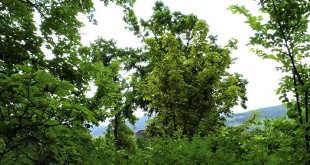 Zwischen grünen Blättern von Bäumen und Büschen befindet sich ein Gotteshaus