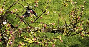 Ein Buntspecht sonnt und putzt sich zwischen rosa-weißen Apfelblüten. Den gelungenen Schnappschuss habe ich in unserem Garten aufgenommen. Der Vogel ist durch sein buntes Federkleid kaum zu erkennen. Text/Foto: Helmut Gleuel