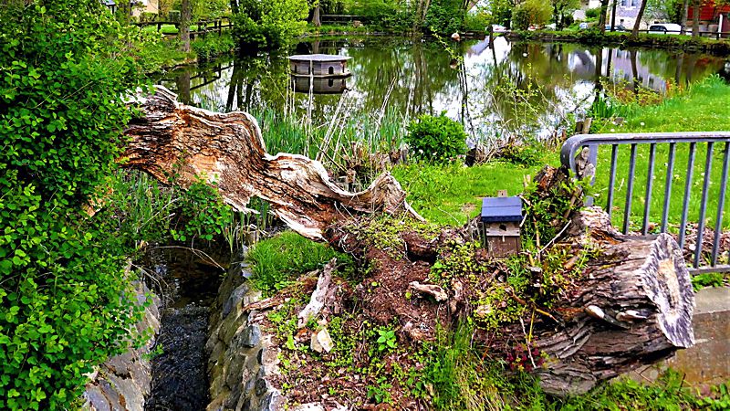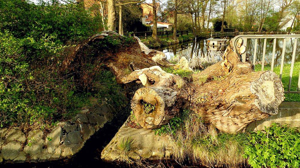 Es handelt sich um die über dem Wasserzulauf des Dorfteiches im Bad Harzburger Stadtteil Schlewecke zurückgestutzte Weide.