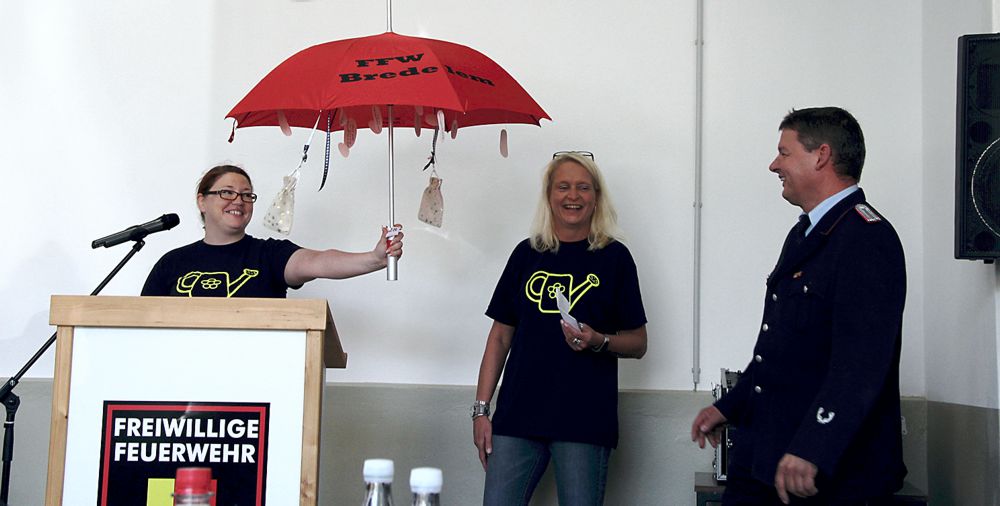 Ein Präsent überreichte Harald Beckmann, Wehrführer der Feuerwehr aus Anderbeck in Sachsen-Anhalt, zu der seit Jahren schon eine Partnerschaft besteht. „Wir lassen die Männer nicht im Regen stehen“, so die Feuerwehrfrauen. Dafür gab es einen Regenschirm mit Geschenken für alle Einsatzkräfte.
