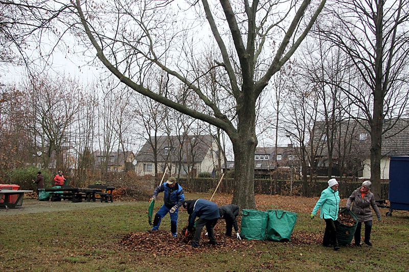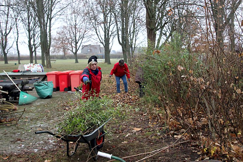 Unter der Organisation von Jürgen Schwarzer wurden die Sitzbänke abmontiert und zahlreiche Sträucher geschnitten und einige Weiden geköpft. Auf einer Fläche von 34.000 Quadratmeter wurde das Laub zusammen geharkt, als Hilfe dienten zwei Laubbläser. Es wurde erst einmal gelagert und später mit der Hilfe eines Landwirts entsorgt.