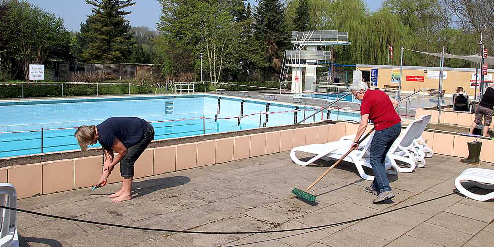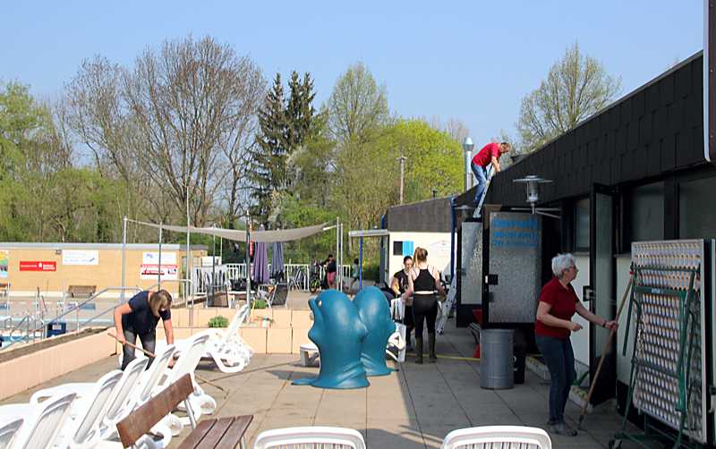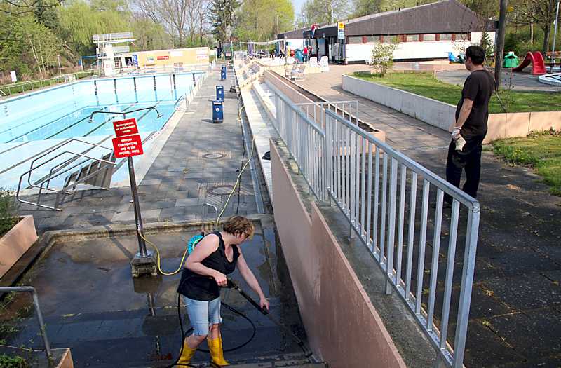 In diesem Jahr bleiben die Eintrittspreise unverändert, zwei Euro für Kinder und vier Euro für Erwachsene, außerdem gibt es zahlreiche Vergünstigungen bei den Dutzend- und Saisonkarten. Um das Bad bis zur Eröffnung fit zu machen, wurde schon zu drei Arbeitseinsätzen aufgerufen. Im Schnitt kommen jeweils 20 bis 25 ehrenamtliche Helfer, um die Becken zu reinigen, einige Fliesen zu erneuern, die Sträucher und Hecken zu schneiden sowie die beim Hochwasser die beschädigten Bauschutzmatten neu unter die Solaranlage zu verlegen. Nun wurden am Samstag die Liegen geschruppt und die Fliesen mit einem Hochdruckreiniger gereinigt. Die Umkleideräume wurden ausgeräumt und anschließend gereinigt. Außerdem musste auf den zahlreichen Grünflächen der Rasen gemäht werden und das Unkraut aus den Fugen auf den Wegen ausgekratzt werden.
