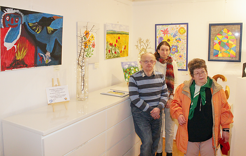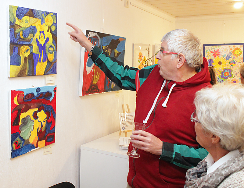 Damit die Künstler mit Behinderung sich entsprechend ihren Möglichkeiten einbringen können, werden viele Werke in Gemeinschaftsarbeit fertiggestellt. Aber auch viele Einzelstücke sind in der Ausstellung zu sehen. Grundlage für die gesamte Arbeit ist die Freude am Malen. Ziel ist die Verwirklichung der eigenen Phantasie und Kreativität. Bilder in Acryl, Collagen, Kratztechnik, Kartoffel- und Blätterdruck sowie gemalt mit Wachs- und Filzstiften sind ausgestellt. Zu sehen sind viele tolle Werke, u.a. alle vier Jahresabschnitte, ein Feuerwerk, das Abendmahl, die Heilige Nacht, der Rammelsberg, das Schützenfest, ein Strandleben, verschiedene Blumen, Kornfelder, bunte Blumenwiesen und Willy in der Badewanne.