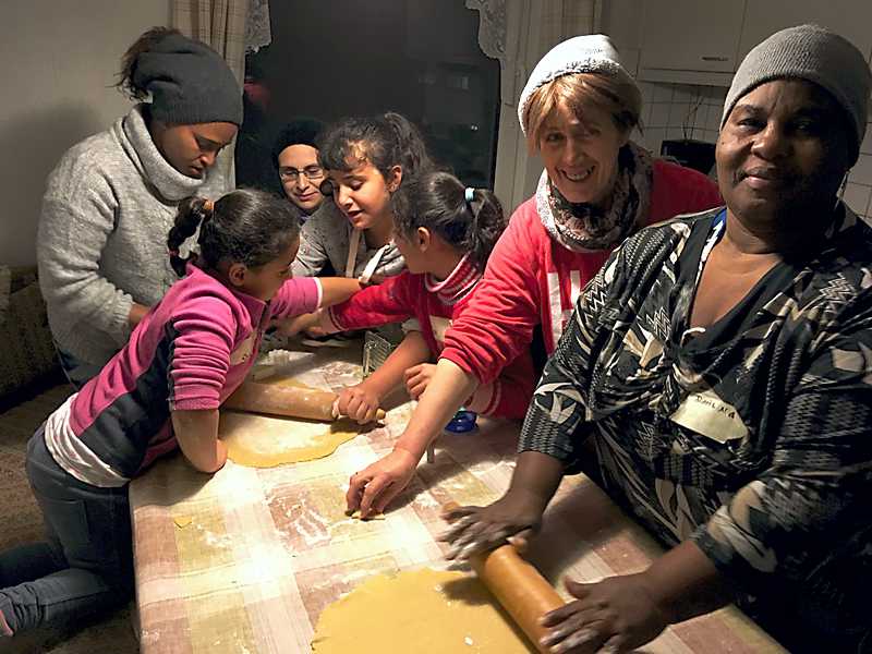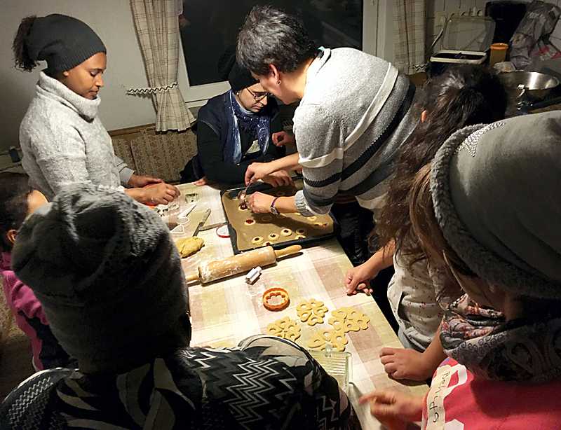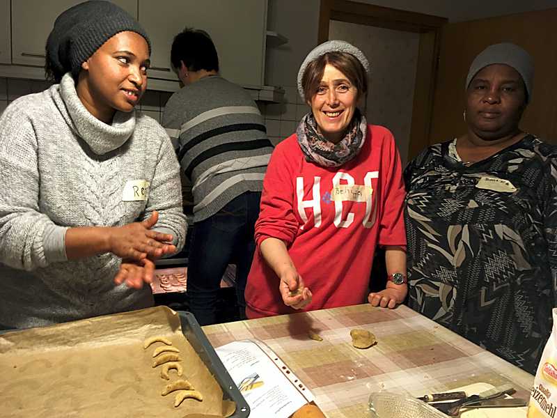 Unter Anleitung von Bettina Brede-Nerjes und Almut Broihan wurde von Frauen aus Syrien, Albanien, Sudan, Syrien, Irak, Eritrea, Albanien, Tschetschenien Weihnachtsgebäck hergestellt. Es entstand eine reiche Vielfalt an Keksen. Aus Mürbeteigplätzchen wurden verschiedene Motive wie Tannenbäume und Sterne ausgestochen und nach dem Backen bunt verziert. Natürlich durften Vanillekipferl, Marmeladenplätzchen und Spritzgebäck nicht fehlen.