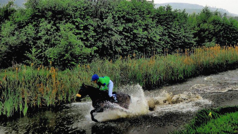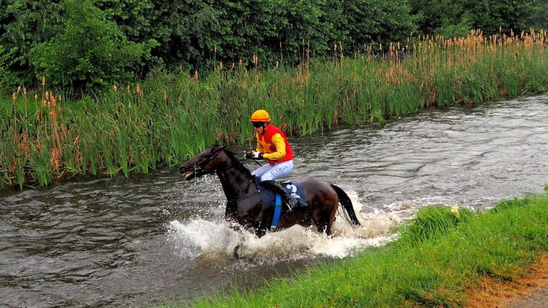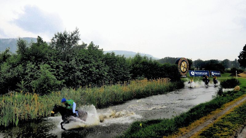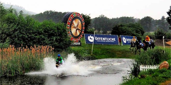 Beim ersten 3550 Meter langen Parcours, der durch eine landschaftlich wunderschöne Kulisse über Hindernisse und den gegenüber dem Ziel gelegenen Karl-Heinz-Salzmann-See führt, rutschte die sechsjährige Stute Gelona im knietiefen See aus und warf den Jockey V. Korytar vom Sattel. Die DLRG-Rettungsschwimmer brauchten nicht eingreifen. Sieger wurde der favorisierte 7-jährige Wallach Falconettei mit Cevin Chan im Sattel.