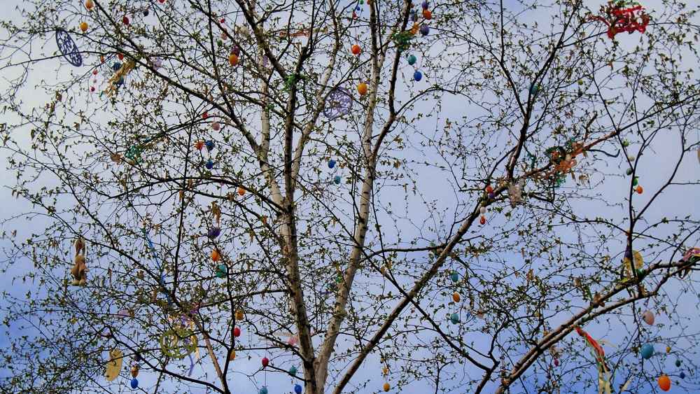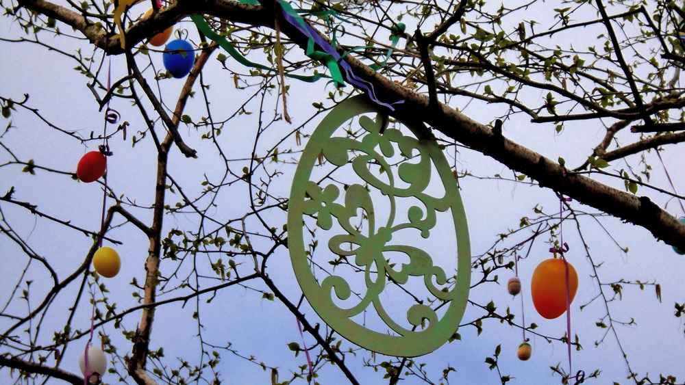 Kinder haben in Zusammenarbeit mit der Freiwilligen Feuerwehr eine Birke mit vielen bunten Eiern liebevoll geschmückt.