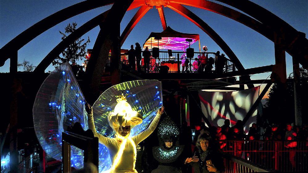 Die Einstiegskrone und der Pfad durch die Wipfel, bis zur 700m entfernten Geologieplattform wurden im prächtigen Farbenspiel beleuchtet. In diesem Jahr wurde als besonderes Highlight eine spektakuläre und mystische Licht- und Soundchoreografie auf dem illuminierten Baumwipfelpfad geboten.