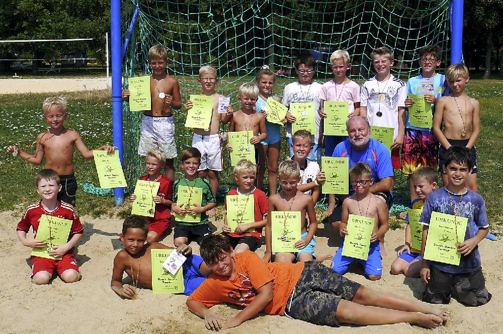 Insgesamt 21 Kinder im Alter von sechs bis elf Jahren, darunter allerdings nur ein Mädchen, Melina, 8 Jahre, sorgten für eine prima Resonanz beim Beachsoccer Turnier. Es waren teilweise Profis darunter, Jugendspieler im SV aber auch Nichtfußballer.