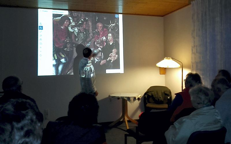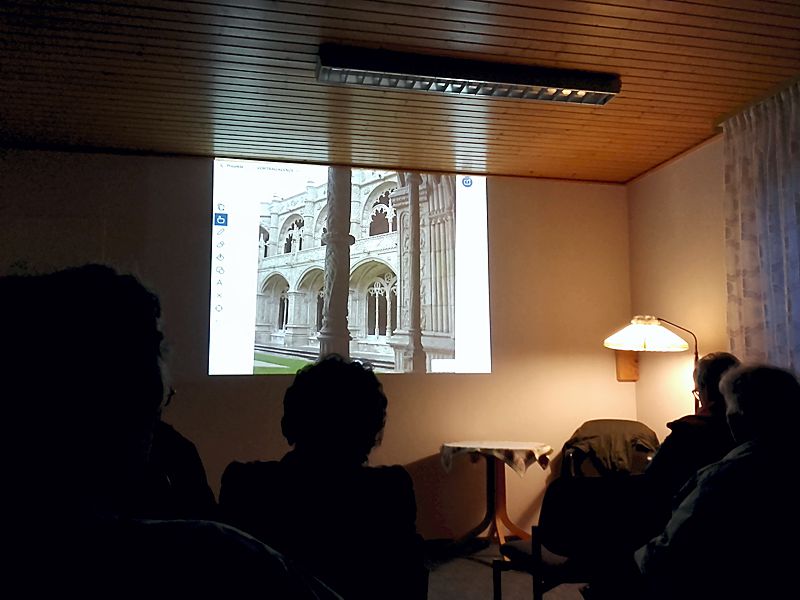 Im seinem weiteren Vortrag erzählte Durwen dann über den wichtigsten Baustil Portugals, dem Manuelinischen Stil. Dieser Stil entstand im 16. Jahrhundert und beinhaltet gotische Einflüsse mit maritimen Elementen und Darstellungen von den vielen Entdeckerreisen. Aus dieser Zeit sind nur noch wenige Bauten und Relikte vorhanden. Durwen zeigte Aufnahmen von zwei Gebäuden, die das schlimme Erdbeben unbeschadet überstanden haben. Hierzu gehört das zum Weltkulturerbe gehörende Hieronymuskloster. Das große Convento ist eine 300 m lange Klosteranlage. Gebaut 1501 bis 1547/48, ist eines der bedeutendsten Gebäude der portugiesischen Spätgotik. Im Kloster befinden sich das Marinemuseum, Grabstätten aller Seefahrer und Könige und das archäologische Museum. Weiter zeigte Durwen ein manuelinisches Fenster, das zu einer Templerburg gehört. Immer wieder konnten die Gäste die vielen Schiffsmotiven, wie z.B. Schiffstaue als Rundbögen oder Rahmenfassungen, bewundern.