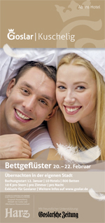 Vom 20. – 22. Februar haben die Goslarer Bürger die Möglichkeit, das eigene Schlafzimmer mit einem Goslarer Hotelbett zu tauschen. Im Rahmen der Aktion „Bettgeflüster“ stehen insgesamt 800 Hotelbetten in 10 Hotels für 10 Euro/pro Stern/pro Nacht zur Verfügung. Das Angebot gilt pro Zimmer, egal ob Einzel- oder Doppelzimmer. Ein leckeres Frühstück kann zum Sonderpreis von 5 Euro pro Person dazu gebucht werden. Buchungsstart ist Montag, der 12. Januar 2015.