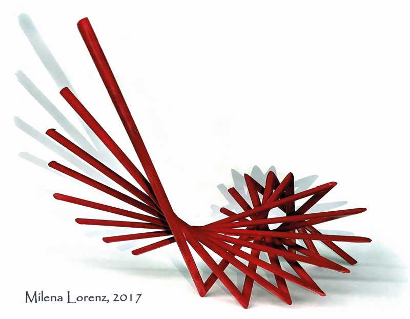 Zwei Beispiele aus der Ausstellung: Die angehende Abiturientin Finnja Marks, 17, verbildlicht in ihrem Werk das Spannungsverhältnis zwischen Vergangenem und Zukünftigem, zwischen Gehalten-Sein und Vorandrängen in der weiblichen Figur. Mit der Entwicklung von Rhythmus im Raum setzt sich Milena Lorenz, 19, in ihrer abstrakten Plastik auseinander. Die Drehung der Gesamtform auf dem Boden und in die Höhe sowie die Filigranität und Komposition der Kunststoffstangen bieten dem Betrachter Assoziationsfreiräume, die von der Bewegungsdarstellung einer Raupe bis hin zur Visualisierung musikalischer Töne reichen, erläutert Lehrerin Kniep.