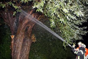 In Wehre im Sudholzweg stand eine große Kopfweide in Brand. Offenbar wurde das Feuer durch einen Blitzeinschlag entzündet, so der Gemeindebrandmeister Daniel Zalesinski. Sofort wurde zum Brand mit zwei C-Rohren vorgerückt. Da der Stamm von innen hohl war und es viele Glutnester gab, entfachte das Feuer immer wieder, so dass letztendlich eine massive Menge Wasser eingesetzt werden musste und sich die Löscharbeiten deshalb sehr lange hinzogen.