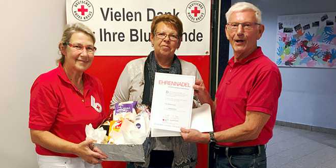 Der 1. Vorsitzende des DRK-Ortverein Vienenburg, Klaus Philipp und die Leiterin des Blutspendeteams, Ilse Fuchs, konnten Martina Kaupe für die 100. Blutspende mit einem Präsent ehren.