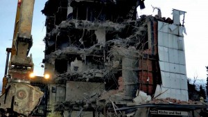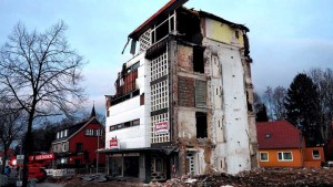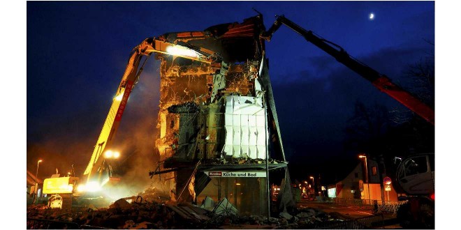 Bad Harzburg-Bündheim. Der Abriss des ehemaligen Möbelhauses Krebs, das in der Nacht am 3. September in Flammen stand, geht weiter. Jetzt frisst sich ein großer Abrissbagger in den mehrstöckigen Gebäudetrakt des Bündheimer Möbelhauses, um Wände und Decken abzutragen. Baggergeräusche, herabstürzendes Baumaterial, Staub und Scheinwerfer prägen das Szenario.