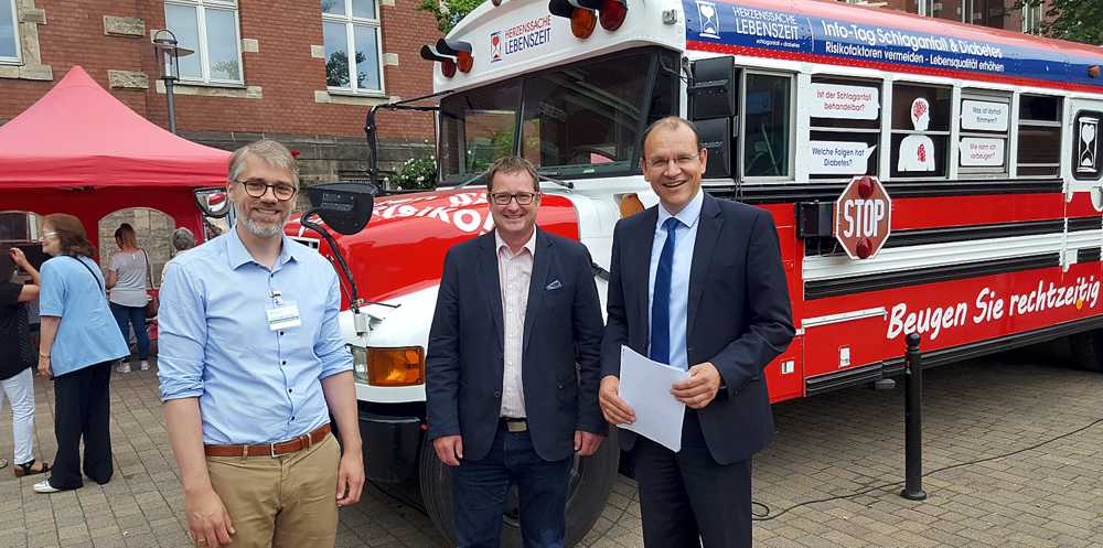 Am Info-Bus in Seesen hatten Interessierte ganz konkret die Möglichkeit, ihr persönliches Schlaganfall-Risiko testen zu lassen und offene Fragen im direkten Gespräch mit Fachärzten und anderen Experten zu dem Thema bzw. auch zu Diabetes zu besprechen. Außerdem konnten sie eine orientierende Ultraschalluntersuchung der hals- und hirnversorgenden Gefäße durchführen lassen. In Deutschland haben jährlich rund 270.000 Menschen einen Schlaganfall.