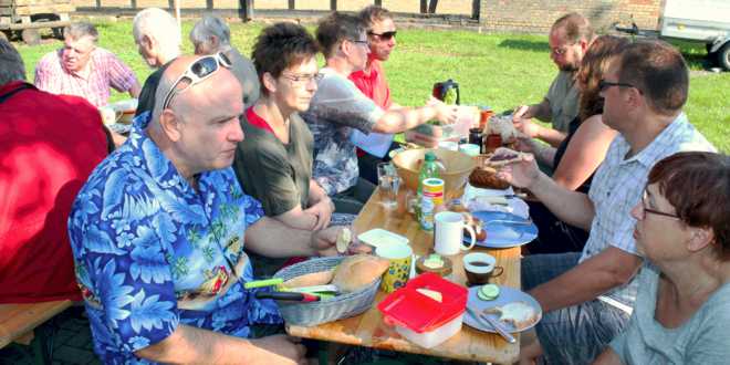 Es brachten viele leckere Sachen mit, von denen auch andere Teilnehmer probieren konnten, einige verzehrten die vom Veranstalter angebotenen Brat- oder Bockwürste. Kaffee und Tee wurden kostenlos angeboten, alkoholfreie Getränke konnten zu günstigen Preisen erworben werden.