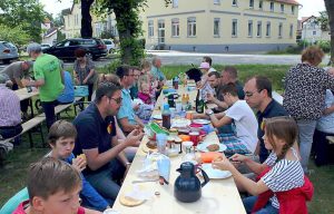 Im vergangenen Jahr musste das Bürgerfrühstück unter die Pergola auf dem Schulhof der Grundschule verlegt werden. Die Sonne meinte es in diesem Jahr so gut, dass die Tische und Bänke im Schatten der Lindenbäume aufgestellt wurden. Obwohl das Wetter mehr zum Schwimmengehen einlud, waren immerhin über 70 Personen gekommen, um ihren Frühstückshunger an den vielen mitgebrachten Spezialitäten zu stillen. So konnte man sich an selbsthergestellten Marmeladen, Käse, Fisch Radieschen, Gurken aus Erwin’s und Wolfgang’s Garten sowie eigenen Garten-Erdbeeren, Wurst, Salaten und Eier von eigenen Hühnern erfreuen. Als Getränke waren Kaffee, Tee, Sekt und andere Erfrischungsgetränke reichlich vorhanden.