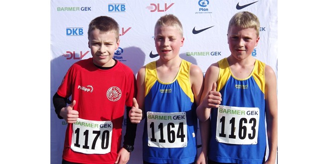 Foto zeigt die drei U14 Sieger im Rahmenwettbewerb der Deutschen Meiterschaft im Crosslauf: (Gold Julius Kappe – Silber Johannes Kappe, beide TSG Bad Harzburg – Bronze Jan Roßkothen LC Adler Bottrop).