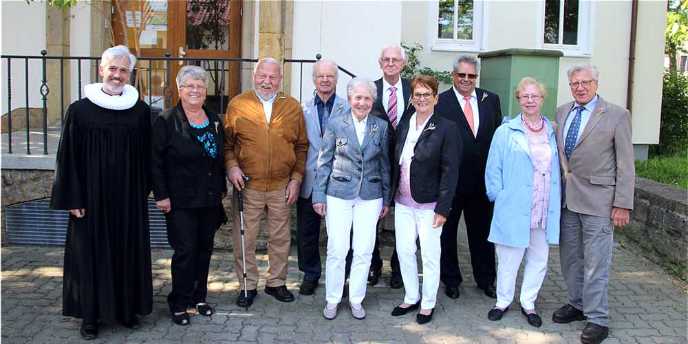Von links: Pfarrer Andreas Jensen, Rosemarie Rusch (geb. Weiß), Olaf Stiller, Herbert Kornhardt, Erika Sobisiak (geb. Papst), Reiner Ahrens, Renate Wünsche (geb. Kuhnert), Artur Schmidt, Ingeborg Lubig (geb. Brandt), Karl Heinz Wüllenweber.
