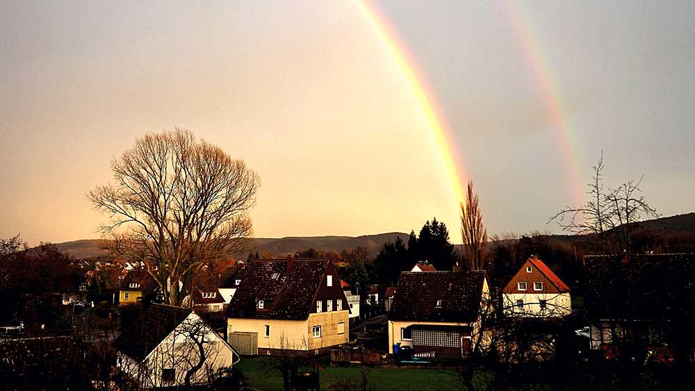 Nachdem am 4. April gegen 18:40 Uhr ein heftiges Gewitter mit kräftigem Regenschauer über Bad Harzburg gezogen ist, leuchtete ein Doppelregenbogen über der Stadt.