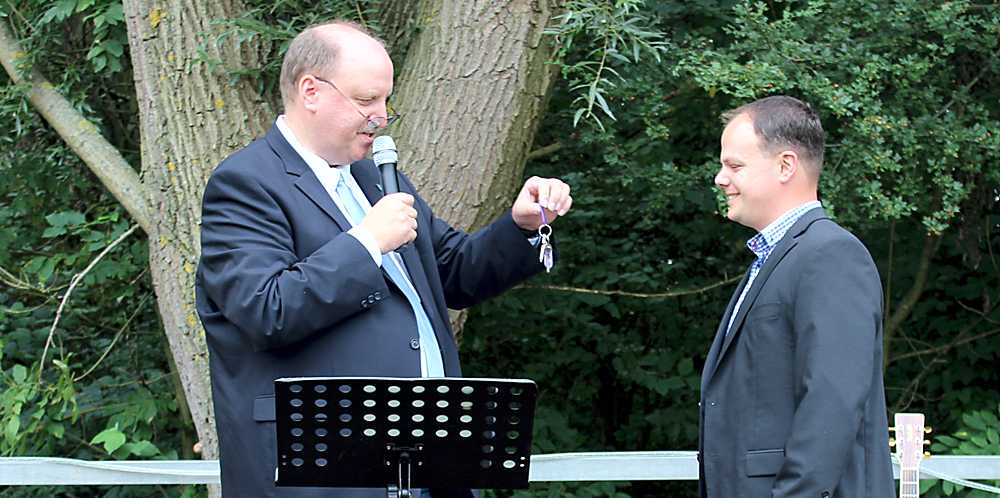 Bürgermeister Andreas Memmert überreicht Ortsbürgermeister Tobias Schliephake den Schlüssel für das DGH.
