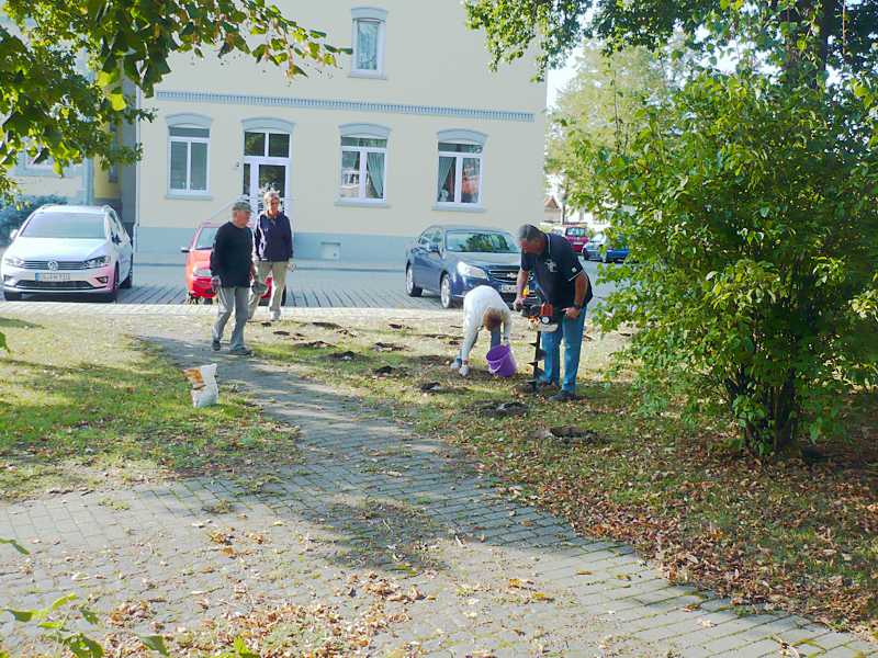 Ausgesucht wurden die Grünflächen um das Denkmal des heiligen Johannes Nepomuk und um das Feuerwehrgerätehaus. Da es in den letzten Wochen sehr wenig geregnet hatte, wurde am Vortag mit Hilfe von Kai Wegener der Boden gewässert, damit die Erde weich wurde. Dankenswerter Weise hat uns Jürgen (Fritze) Buhmann wieder einen Erdbohrer zur Verfügung gestellt, um die Pflanzlöcher auszuheben. Immerhin wurden 1300 Blumenzwiebeln in die Erde gelegt.