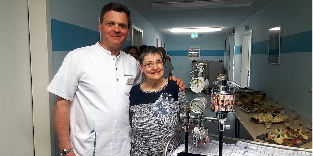 Wenn man die 35 Jahre in Narkoseminuten umrechne, die sie Patienten behandelte, dann haben Sie bestimmt einen Großteil Ihres Arbeitslebens in der Klinik am Narkosegerät verbracht, rechnete Prof. Heine anerkennend hoch. Zum Abschied gab es vom Anästhesie-Team ein dekoratives, altes Narkosegerät aus den 1980-er Jahren, an dem die Oberärztin noch selbst gearbeitet hatte, beleuchtet und verziert mit Fotos von Mitarbeitern aus der Abteilung.