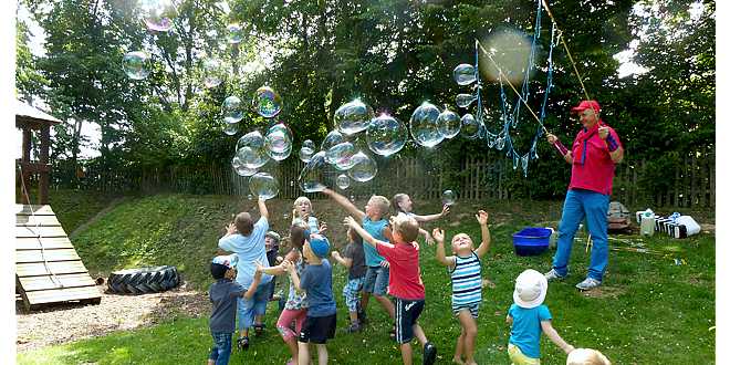 „Es ist schön sowohl die Kinderkrippe als auch den Kindergarten in einer Einrichtung vereint zu haben“, so Annette Dörr. Sie ist froh über das gute Zusammenspiel der beiden Bereiche. Die Kindertagesstätte Döhren besuchen 22 Kindergartenkinder und 10 Krippenkinder. Neben singen und einem Bastelangebot war der Höhepunkt des Sommerfestes der Auftritt des Seifenblasenmannes Eddie Scott aus Meinersen. Er lud die Kinder zur Jagd nach den Seifenblasen ein.
