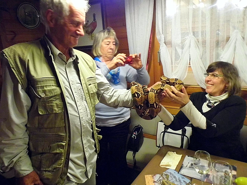 Für einen Höhepunkt des Abends sorgte Jürgen Hergert, als er mit einer seiner Schlangen die Gäste in seinen Bann zog. Für die meisten war es das erste Mal, dass sie eine Schlange anfassen und berühren konnten.