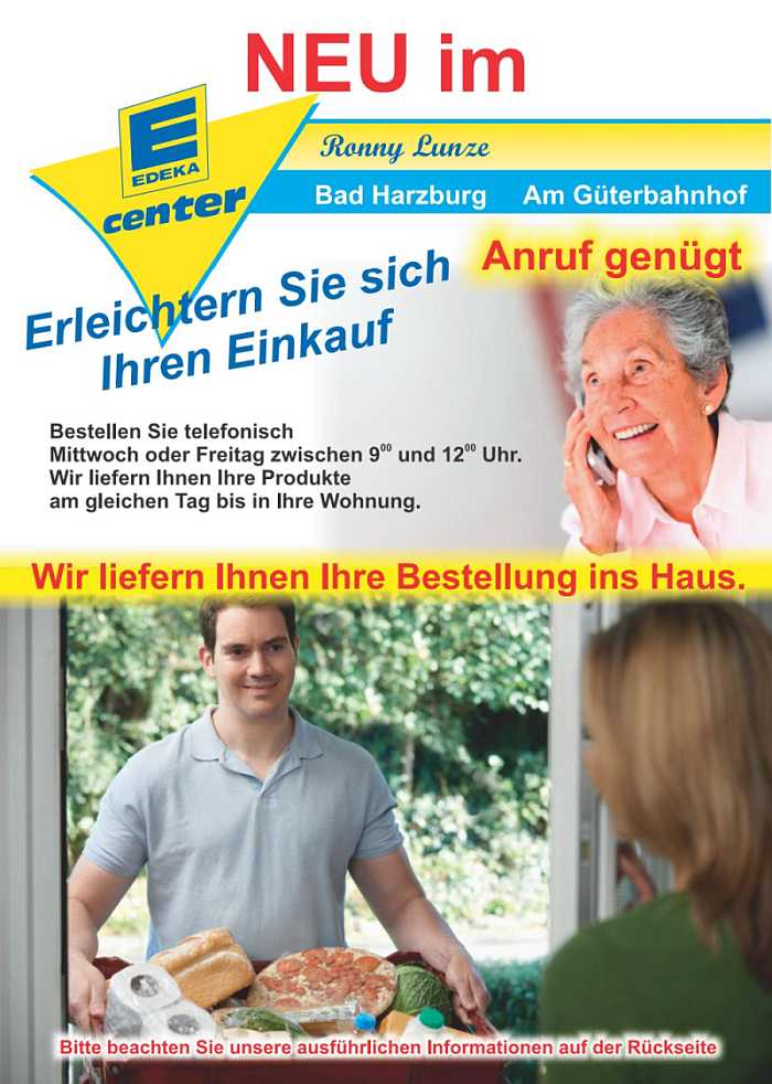 Aufgrund der steigenden Nachfrage wird dieser Service ab dem 18. Januar 2017 erweitert: Jeweils mittwochs und freitags in der Zeit zwischen 09.00 Uhr und 12.00 Uhr können nun auch Bestellungen telefonisch aufgegeben werden. Die Waren werden noch am gleichen Nachmittag geliefert. Ausführliche Informationen und Preise erhalten Sie in den ausliegenden Flyern im E-Center am Güterbahnhof.