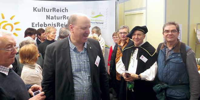 Auf dem Messegelände in Berlin angekommen, konnte jeder zunächst in den zahlreichen Hallen seine eigenen Besuchsschwerpunkte setzen. Gegen Mittag trafen sich alle Mitreisen in der Halle „Niedersachen“ zu einem gemeinsamen Treffen am genannten Ausstellungsstand. Hier gab es einen herzlichen Empfang von den Mitarbeitern des ILE-Projektes sowie Bürgermeister Andreas Memmert, der uns mit Hornburger Hopfenlikör, Bonbons und Mettwurststückchen beköstigte. Die Region wurde an diesem Tag präsentiert durch die historische Person „Amtmann Brandes“, dargestellt von Herbert Grünhage aus Hornburg. Anschließend war noch genügend Zeit, sich in den restlichen Hallen umzuschauen. Es gab für jeden nach eigenem Geschmack viel zu sehen, zu bestaunen und zu verkosten.