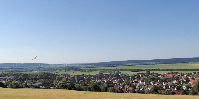 Ein Modellflugzeug mit der Spannweite von 3,60 Meter befindet sich im Landeanflug auf den Harlingeröder Flughafen Langenberg.