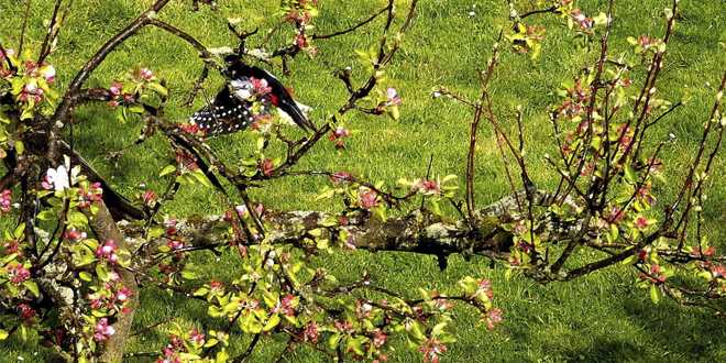Ein Buntspecht sonnt und putzt sich zwischen rosa-weißen Apfelblüten. Den gelungenen Schnappschuss habe ich in unserem Garten aufgenommen. Der Vogel ist durch sein buntes Federkleid kaum zu erkennen. Text/Foto: Helmut Gleuel