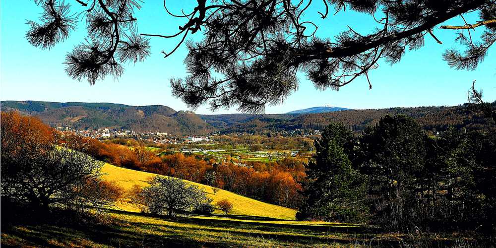 Ein Blick über Bad Harzburg mit Galopprennbahn und Burgberg zum teilweise noch schneebedeckten Brocken zeigt, dass die Natur hat mächtig aufgeholt und den Winter endgültig besiegt hat.
