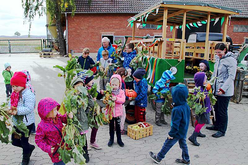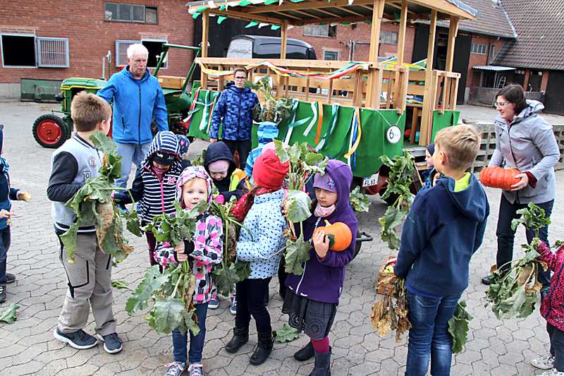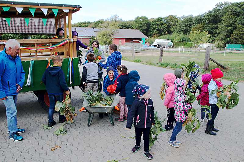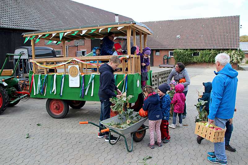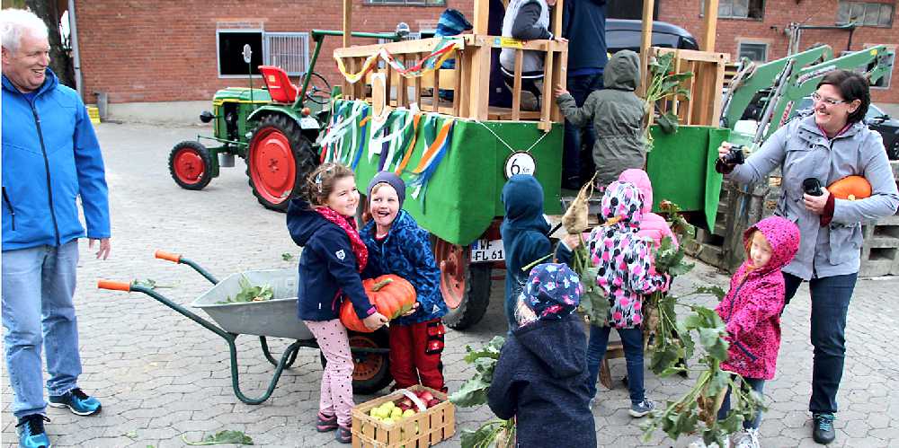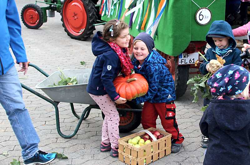 Mit den Kindern der Kinderkirche der evangelischen Kirchengemeinde sammelte Pfarrerin Sonja Achak die Erntegaben für den Familiengottesdienst ein. Sascha Seuber startete mit seinem Deutz, Baujahr 1954, an der Kirche und auf dem Anhänger nahmen die Kinder, Pfarrerin Sonja Achak, die Kirchenvorstandsmitglieder Ingrid Jakobiak und Peter Müller Platz. Zuerst wurden die Schladener Haushalte angefahren, die sich vorher für eine Spende angemeldet hatten. Zum Abschluss wurde außerhalb von Schladen, zum Hof Bocklah, gefahren.