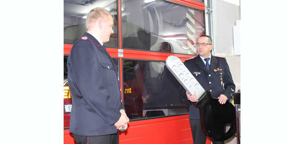 Oberbürgermeister Dr. Oliver Junk überreichte an Stadtbrandmeister Christian Hellmeier einen überdimensionalen Schlüssel, der reichte ihn an „Hausherr“ Ortsbrandmeister Hendrik Zimmermann weiter.