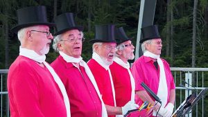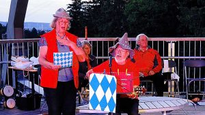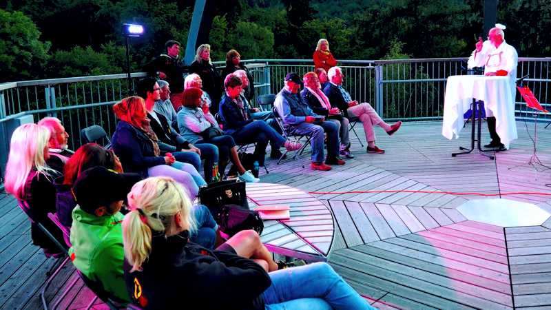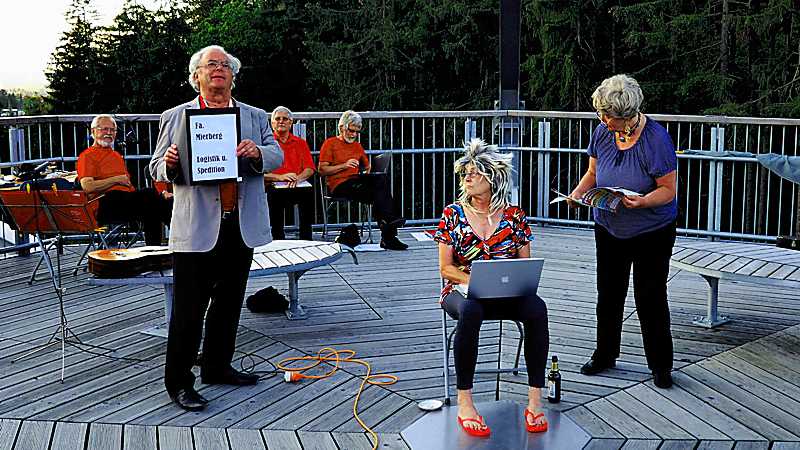 Auf der Veranstaltungsplattform der Eingangangskrone des Baumwipfelpfades fand jetzt zum Abschluss der Veranstaltungssaison erstmals ein außergewöhnliches Kabarett statt. Das 9-köpfige Ensemble setzt sich größtenteils aus pensionierten Lehrkräften zusammen, die aus Braunschweig, Hildesheim, Liebenburg, Nordstemmen und Peine kamen. Sie treten seit rund 4 Jahren vor unterschiedlichem Publikum auf und schreiben ihre Texte zum großen Teil selbst. Dabei werden schulische Gegebenheiten ebenso wie gesellschaftskritische Situationen in den Focus genommen.