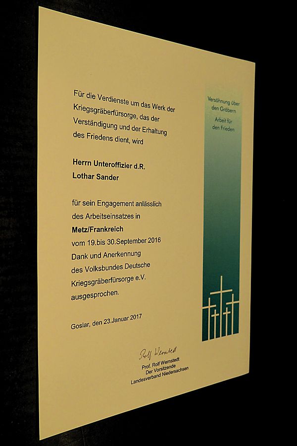 haben durch ihren mit großem Engagement durchgeführten Kriegsgräberpflegeeinsatz einen wichtigen Beitrag zur Völkerverständigung und für den Frieden geleistet“, betonte Landrat Brych. Mit großer Freude überreichte er ihnen eine persönliche Dankesurkunde, die Prof. Rolf Wernstedt als Vorsitzender des Landesverbandes Niederachsen unterzeichnet hat, und ein Buchpräsent des VDK.