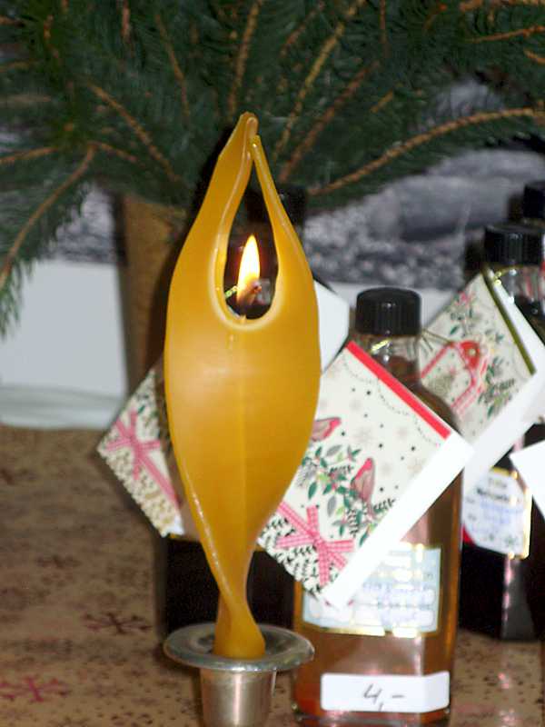Stimmungsvolle Engelkerzen und andere Kerzen aus Bienenwachs, selbst gemachte Marmeladen und Liköre bot der Förderkreis an.