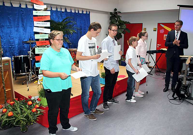 Dann gab es die lang ersehnten Abgangszeugnisse von Schulleiterin Myriam Albers. Die fünf gehen demnächst zur Lebenshilfe nach Goslar, an die Berufsbildenden Schule in Seesen oder in eine berufsqualifizierende Maßnahme an der ARGE.